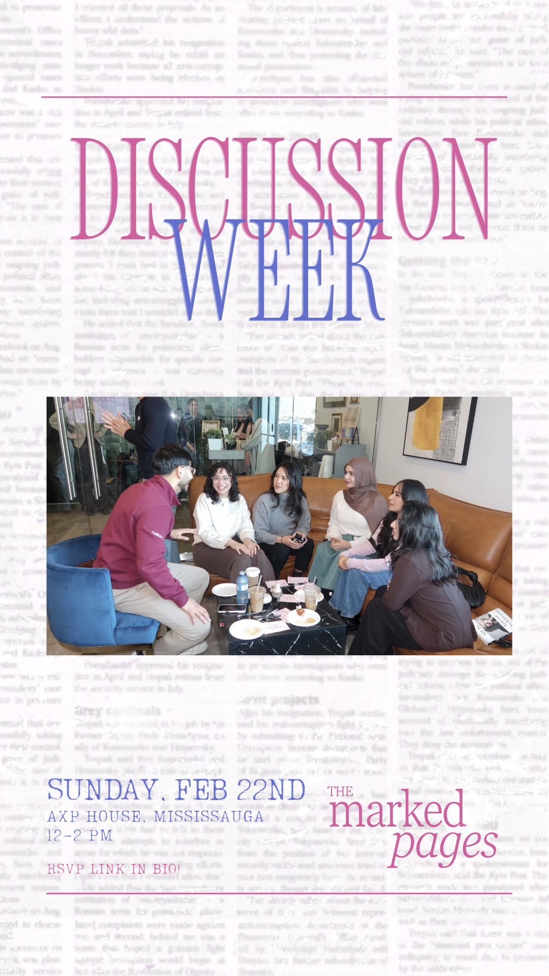 The Marked Pages is a book and conversation club designed to bring people together through thoughtful discussion and shared ideas. While books are an important part of the experience, the club goes beyond traditional reading groups to explore essays, articles, current events, and global stories in an interactive and welcoming setting. Meetings are intentionally relaxed and community-focused, encouraging open dialogue, curiosity, and connection rather than academic pressure. Some sessions center around a selected book, while others focus on guided conversations and member-led discussions inspired by articles or cultural moments. The Marked Pages is for anyone seeking meaningful conversation, intellectual curiosity, and a cozy space to connect with like-minded people.